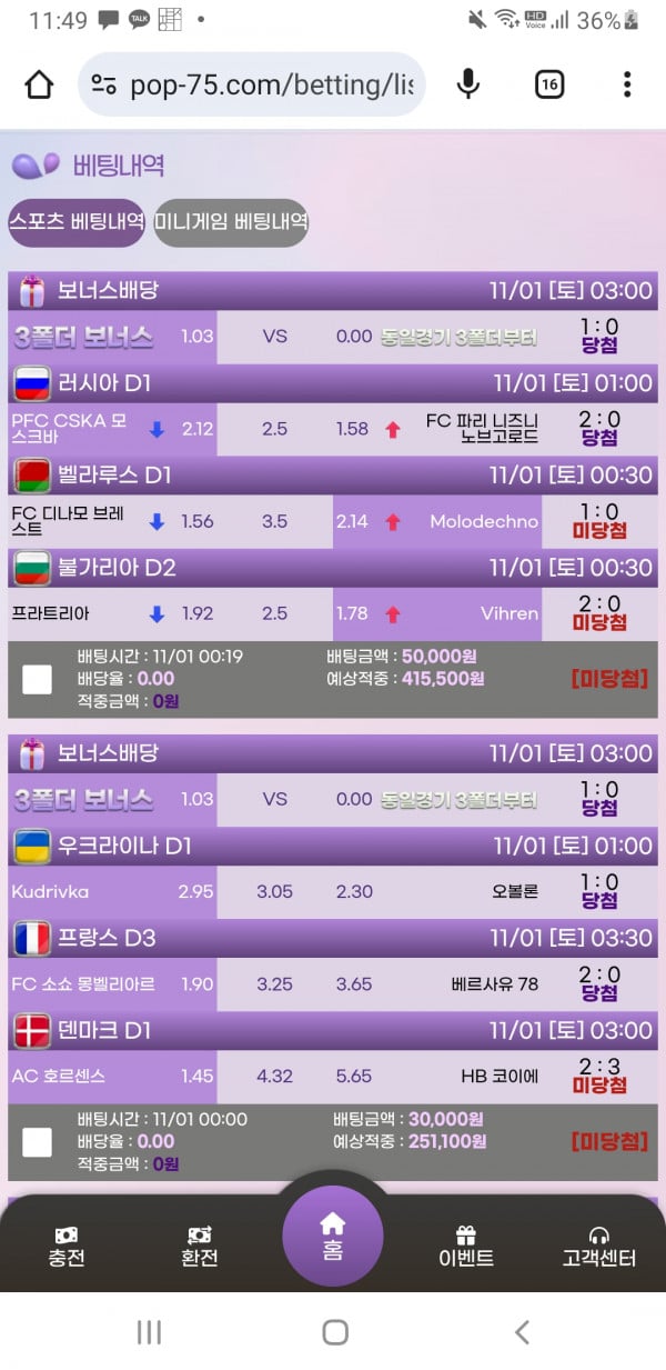 벌써 1년이 훅 지나가는데 사이트는 이벤도 수시로 하고 지인 추천도 다양한데 나는 적중이 어렵다ㅠㅠ무엇보다,,급하게 돈이 뿔리고 싶을때 유럽형 스포츠 들어가서 실시간도 좋지만 너무 오래걸려서 가상축구를 즐기는데 은근 재밌다,,물론 100프로 촉이다 ㅋㅋ,, 현실에서 잘 나오지 않는 역배도 잘 나오고 한번쯤 접해볼만 하다고 생각이든다 다양하니 이용 해보시길